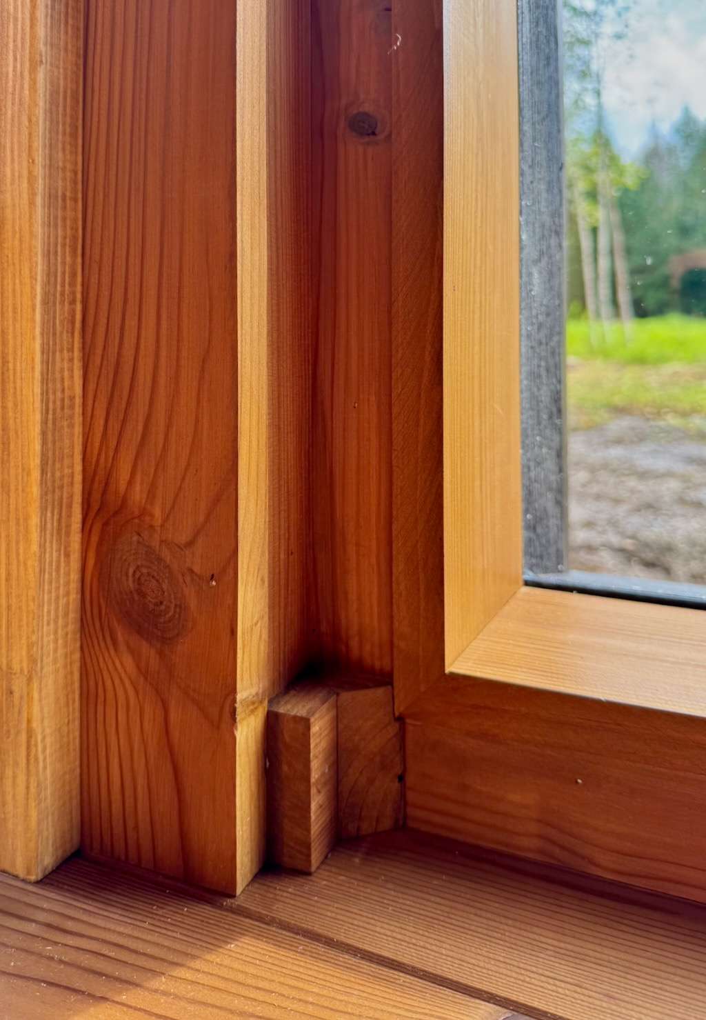 Das Innere besteht aus thermisch behandeltem Kiefernholz, das den Temperatur- und Feuchtigkeitsschwankungen standhält. Es wird mit einem speziellen Wachs behandelt, separat für Wände und 2-fach für Sitze und Boden. Wahlweise kann man die Innenverkleidung auch in hellerem, ruhigerem Thermo Espenholz bestellen.
